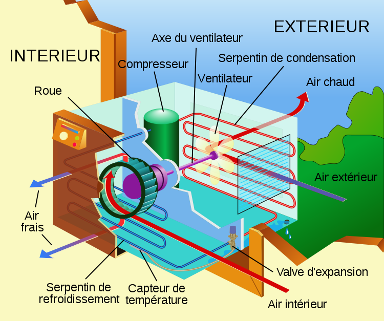 Le principe de fonctionnement d'un climatiseur est expliqué sur le schéma suivant.
